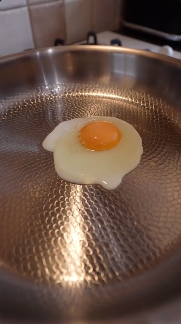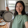 Our pans use 100% pure Grade 1 titanium, finished with a hand-hammered microtexture. This creates natural valleys that minimize sticking, improve airflow, and make the pan hydrophobic over time. It’s a naturally low-stick surface without Teflon, coatings or chemicals.